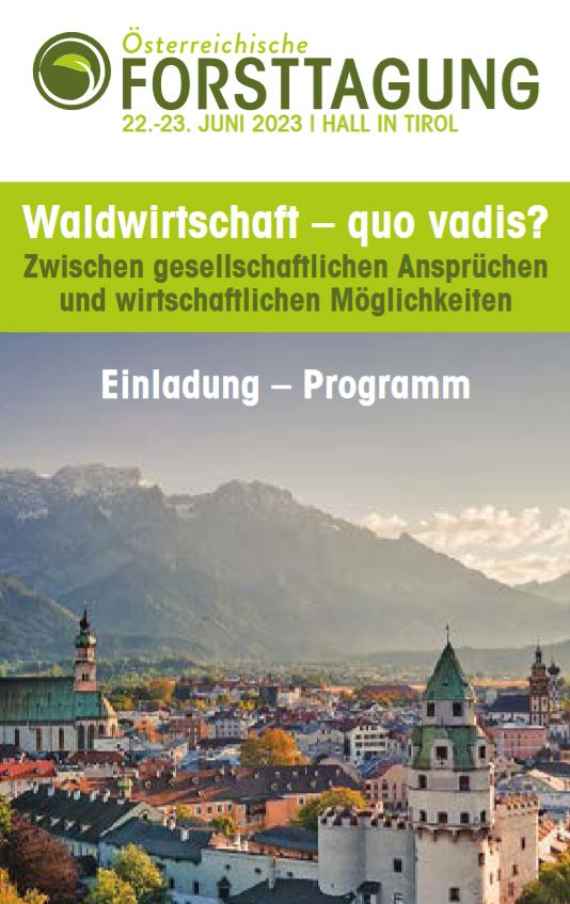 Die Österreichische Forsttagung findet vom 22. bis 23. Juni 2023 in Hall in Tirol statt, Veranstalter sind der Österreichische und der Tiroler Forstverein. Das Tagungsmotto „Waldwirtschaft – quo vadis? – Zwischen gesellschaftlichen Ansprüchen und wirtschaftlichen Möglichkeiten“ soll zu einer intensiven Diskussion über die Möglichkeiten einer künftigen multifunktionalen Waldwirtschaft führen.