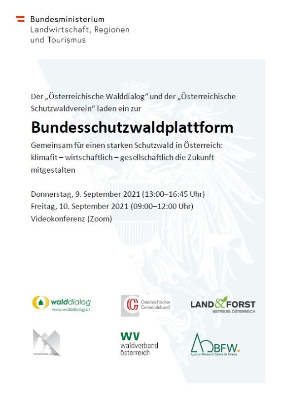 Die Bundesschutzwaldplattform 2021 wurde unter der Federführung des Bundesministeriums für Landwirtschaft, Regionen und Tourismus (Österreichischer Walddialog und Schutzwaldteam der Abt. III/4) gemeinsam mit dem Österreichischen Schutzwaldverein in Kooperation mit dem Österreichischen Gemeindebund, dem Waldverband Österreich, den Land&Forst Betrieben Österreich sowie dem Bundesforschungszentrum für Wald veranstaltet.